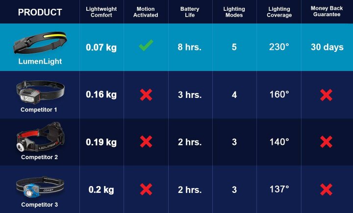 Summary: This innovative LED headlamp is decades’ most significant upgrade to the ordinary flashlight. It WILL change the way you navigate in the dark! Heavy flashlights always run out of batteries. Bumpy light that barely lights up 10 feet in front of you… …Imagine the hassle of having to change a tire in the dark while holding up a heavy flashlight in one hand! Forget all about it. This innovative headlamp features a genius design that makes multitasking possible. Perfect for adventures in the dark, work, and emergencies. It’s LumenLight, a lightweight, highly powerful headlight with the latest tech advancements built-in. Designed and distributed by a Australian company with years of experience in hi-tech gadgets, it features a number of incredible innovations. Customers praise the ‘light-as-feather’ design that doesn’t put any additional strain and weight on your gear. A motion-activated sensor lets you turn the light on/off without scrambling to find a button. Even better, 5 different light modes adapt to various tasks – whether you need the full ultra-bright wide-angle beam to light your way in the dark or a spotlight to fix your car. Engineers equipped the LumenLight Headlamp with various features that anyone can easily use regardless of their age or gender. That is why the LumenLight LED Headlamp has already been the number one best-seller gadget among both, regular folk and passionate adventurers. The LumenLight engineers focused on solving 2 of the main problems that conventional headlights and torches have: heavy weight that causes strain and light to jump around and multitasking. The result is a powerful headlamp equipped with the latest tech in a sleek and comfortable design. Super Lightweight – slimline battery, soft elastic band, and tiny LEDs mean you won’t notice it on your head even after hours! Motion Sensor Activated – wave On/Off. No need to scramble in the dark to find the button. Travels Easy – folds away to fit in a pocket easily. Ultra Wide 230° Area Lighting – you can see the path and what lies to the sides of the path, too! 5 Different Light Modes – COB high, COB low, XPE high, XPE low, and emergency strobe signal. Ultra-Bright LED beam – next-gen technology ensures the brightest light on your wide-angle beam with an additional 350-lumen spotlight. Super Low Profile – never gets in the way or gets knocked off your head! Forget the light that bounces up and down. IP6 Waterproof & Impact Resistant – a foolproof design makes this head LED light last forever, no matter the weather conditions. 1200Ah Battery – enjoy up to 8 hours of bright light. One thing is for certain: once you try the LumenLight LED Headlamp, you’ll want to tell your friends and family about it! Will it fit on a hard hat? Is it waterproof? Is it rechargeable? How does the motion sensor work? How wide is the light angle? What’s included in the package? Traditional headlamps start at well over A$200, not to mention their heavy and uncomfortable design and poor battery life. Looking at the features of the LumenLight LED Headlamp, you’d expect to pay way more than that! But it’s much, much cheaper! And you don’t even need to be sure this is the right choice — they offer a 30-day, 100% money-back guarantee. You can try the LumenLight LED Headlight and then decide if you like it. Click here to claim a discounted LumenLight LED Headlight (if it’s still available) >> That’s a small price to pay for your safety and comfort in the dark! No knockoffs, please; the real thing is essential! Don’t get stuck with some ancient prototype! Get your LumenLight LED Headlight from their official website here. As of March 31, 2025 – Ever since the LumenLight LED Headlight was on major international media, an incredible amount of buzz has been generated. Due to its popularity and positive reviews, the company is so confident in its product that they are now offering a one-time, first‑time‑buyer 70% discount. NOTE: This product is NOT available on Amazon or eBay.What Is It?